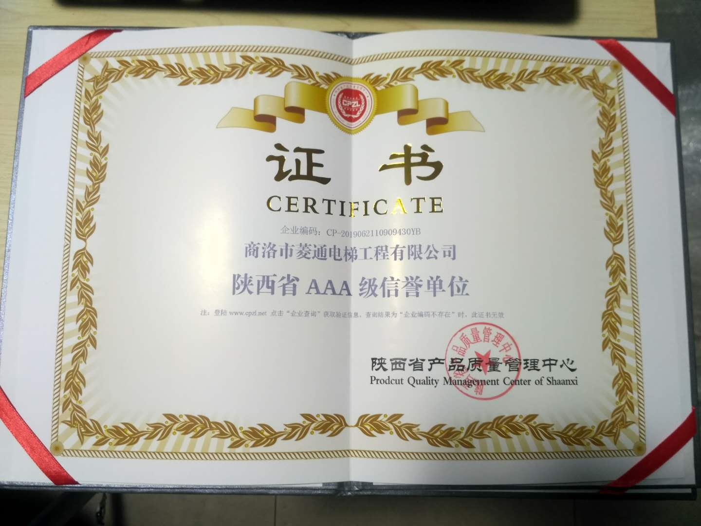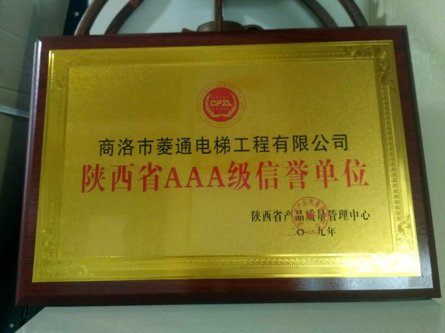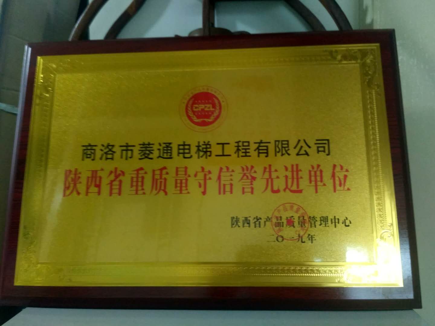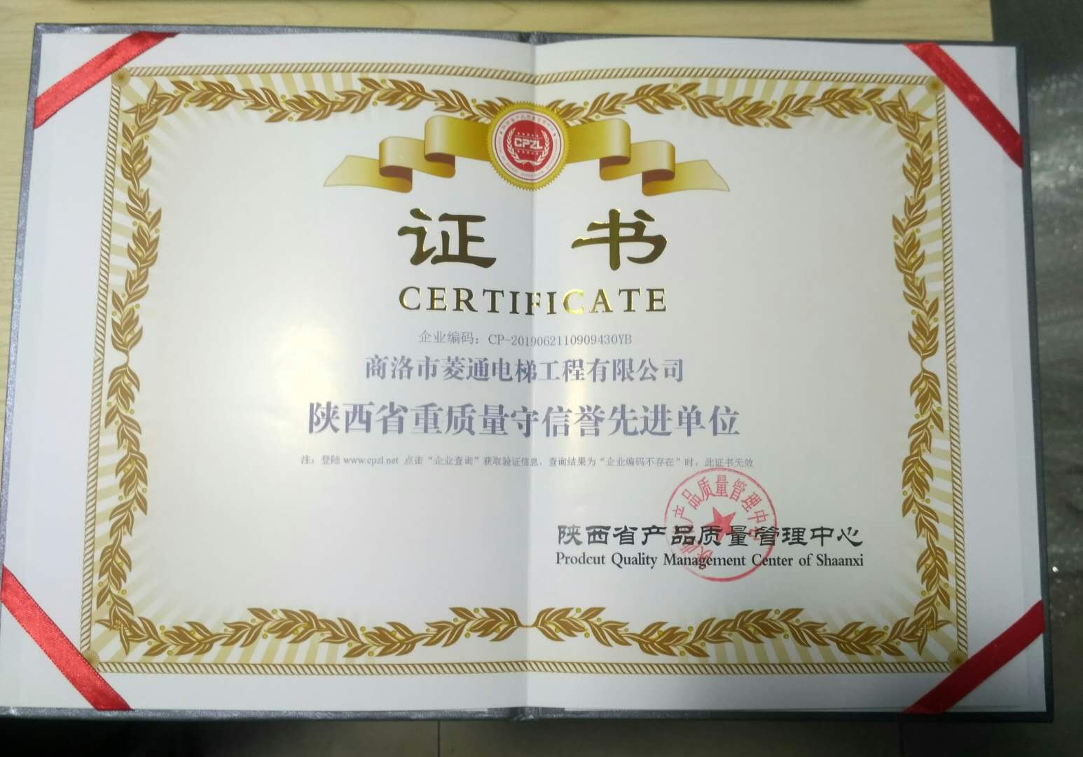 商洛菱通電梯工程有限公司,2019年很榮幸被陜西省產(chǎn)品質(zhì)量管理中心評為:陜西省AAA級信譽單位和陜西省重質(zhì)量守信譽先進單位;并頒發(fā)獎牌及榮譽證書。這個榮譽不但得益于各單位的支持與默契合作,更得益于我公司優(yōu)良的團隊氛圍和集體上下一致積極認真的工作態(tài)度。更得益于領(lǐng)導(dǎo)重承諾守信譽:提倡安全第一,質(zhì)量第一,信譽第一的原則。能被評為3A級信譽單位和信譽先進單位,既是對公司工作的肯定,也是對今后工作做得更好的一種鼓勵,我公司定會盡職盡責做得更好。